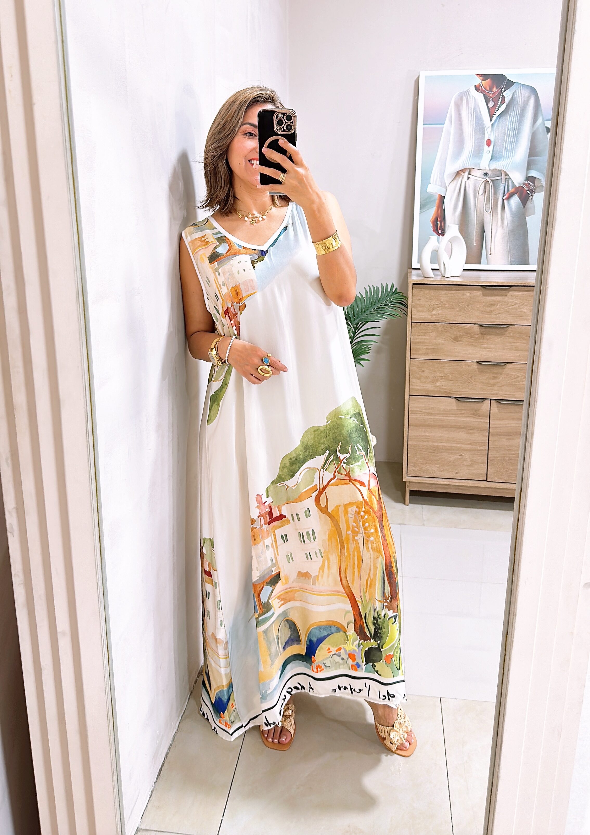 Este es un vestido largo sin mangas que se distingue por su diseño fluido y su estampado artístico inspirado en paisajes coloridos que transmiten frescura a tu outfit. Su tela ligera lo convierte en una prenda ideal para climas cálidos, mientras que su diseño versátil permite usarlo tanto de día como de noche. Un vestido que combina moda, confort y elegancia en una sola pieza.