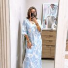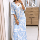 Vestido maxi estampado abstracto con manga corta y cuello en V.