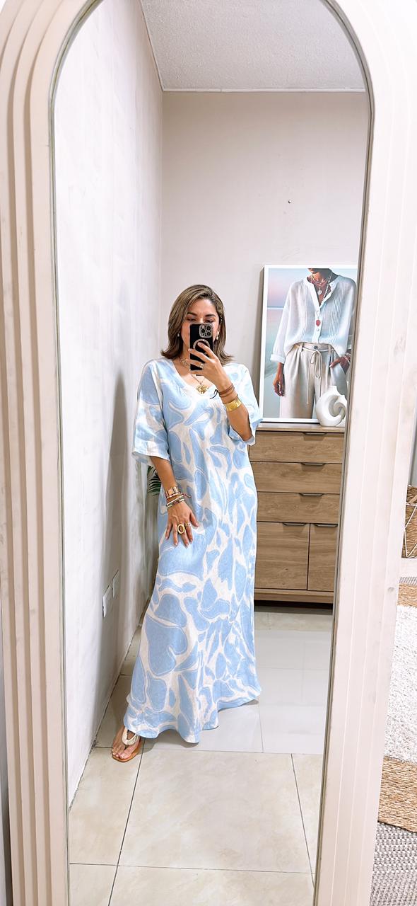 Vestido maxi estampado abstracto con manga corta y cuello en V.