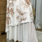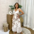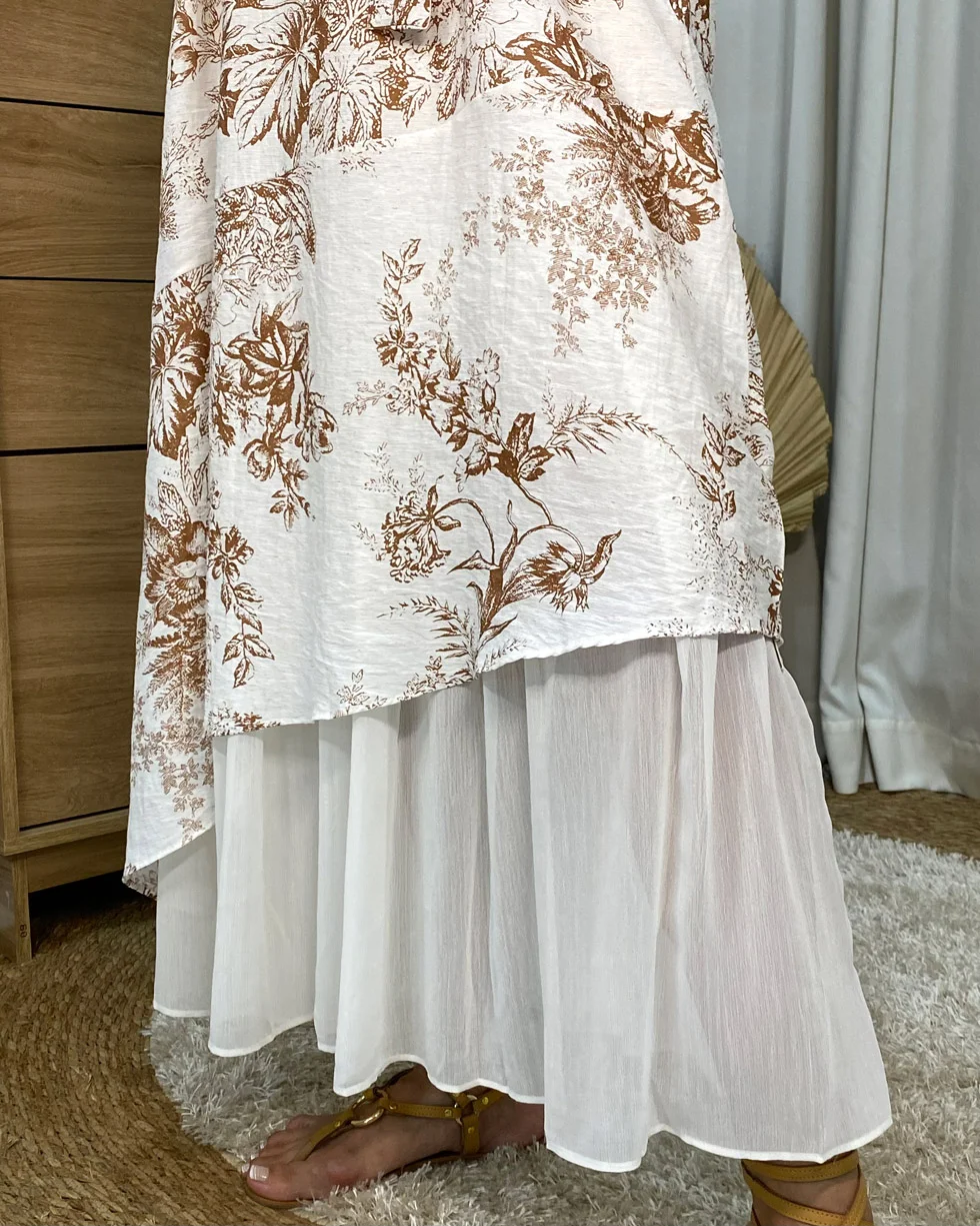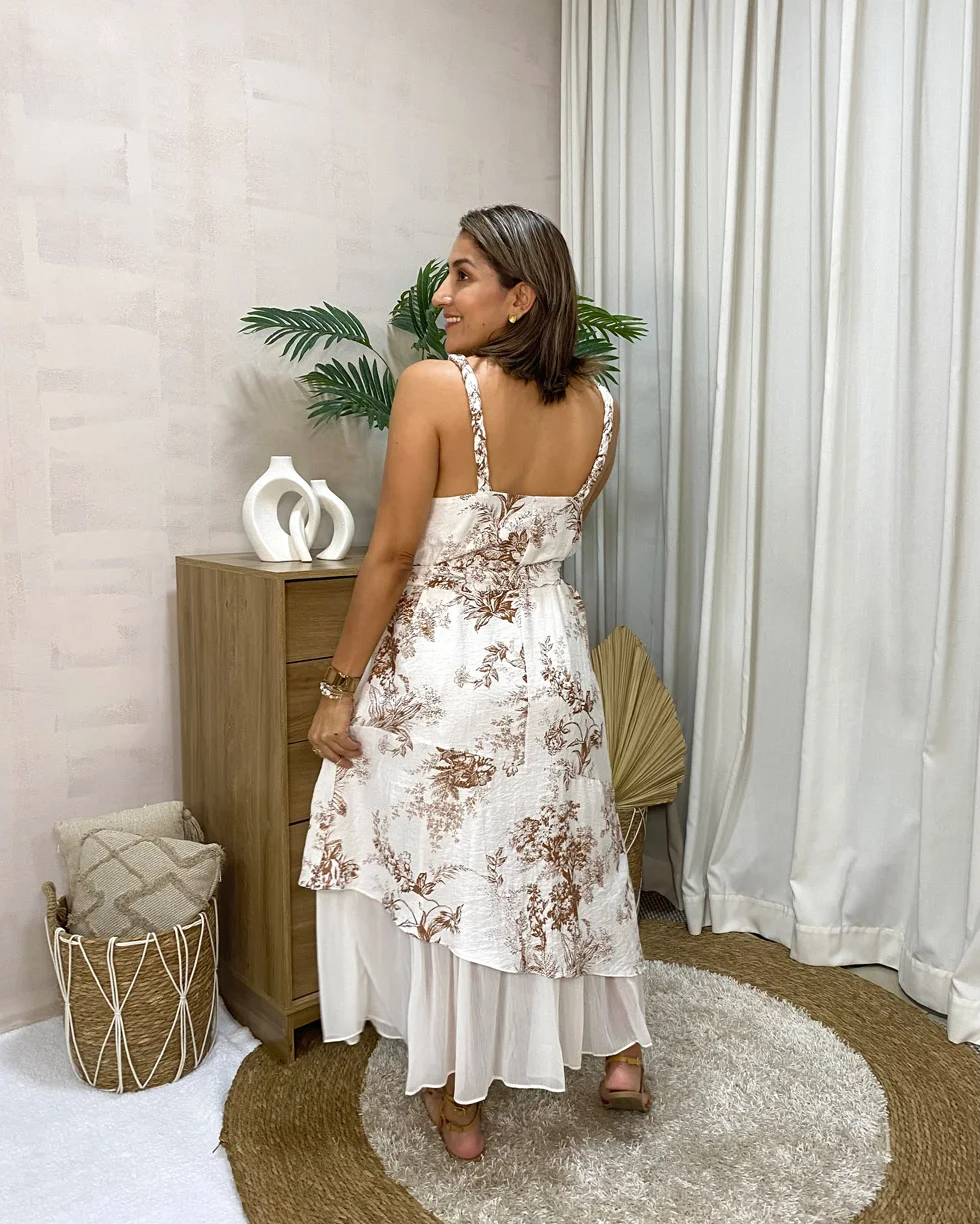 Vestido midi con estampado floral marrón y falda doble capa, fresco y elegante para toda ocasión.